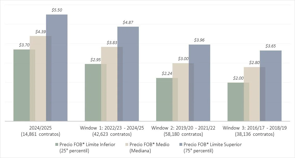 *Libre a Bordo o “Free on Board” (FOB) son los precios pagados por los cafés entregados y colocados en el barco en el puerto en el país de embarque. Este precio incluye cualquier costo de transporte terrestre de beneficios o bodegas al puerto de origen, no incluye ningún costo de envío, seguros, o cualquier costo de transporte, aduanas, y gastos de flete terrestre incurridos a la llegada al puerto de destino. (Cámara de Comercio Internacional)