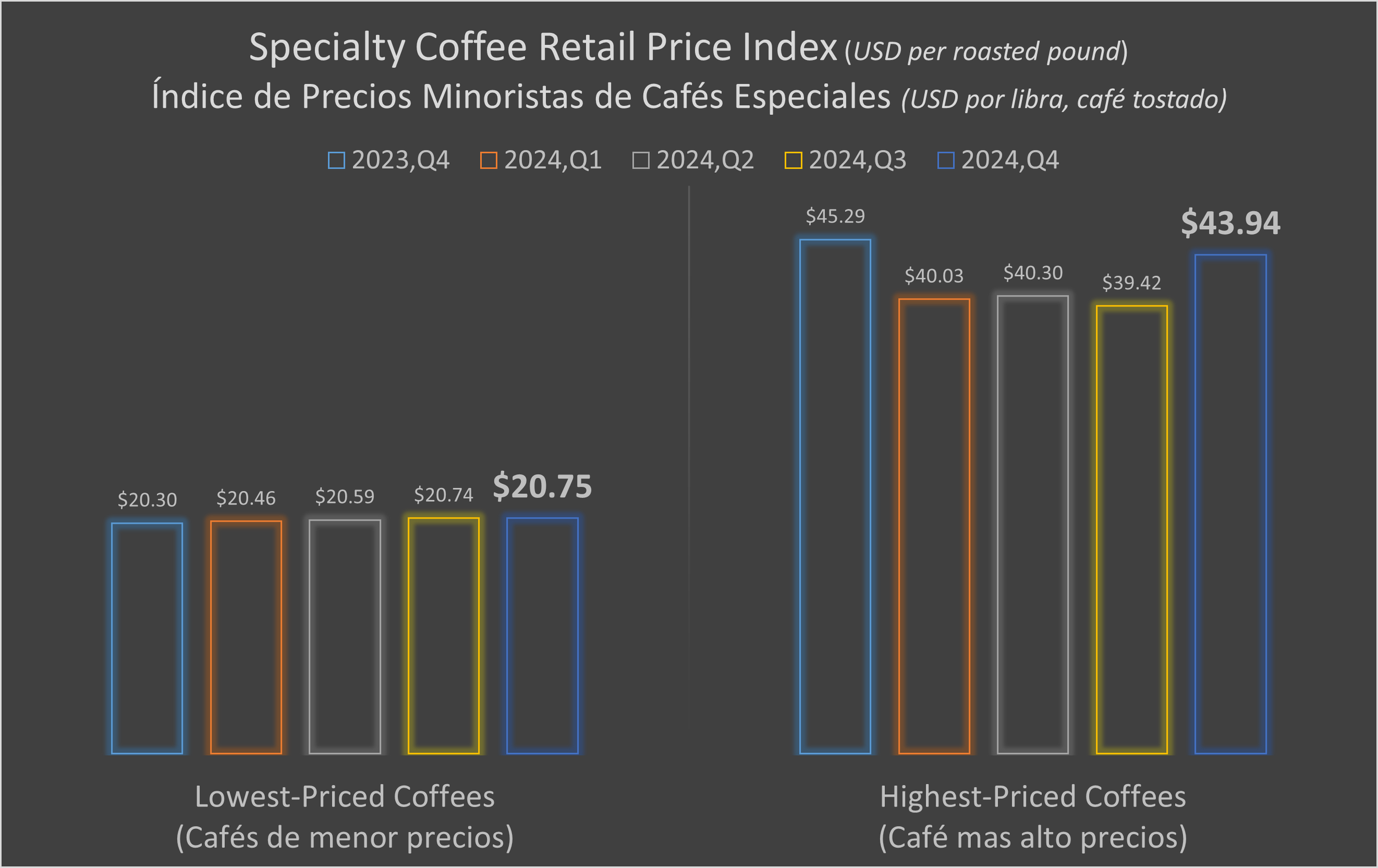 En el cuarto trimestre de 2024, el IPMCE aumento un 7,5%. El precio promedio de los cafés especiales tostados a finales de diciembre del 2024 fue de $32,35 USD por libra. Esto es un promedio de $20,75 USD por libra para los cafés especiales de menor precio (+0,0%), y $43,94 para los cafés de mayor precio (+11,5%) que se venden en los sitios web de los tostadores IPMCE.