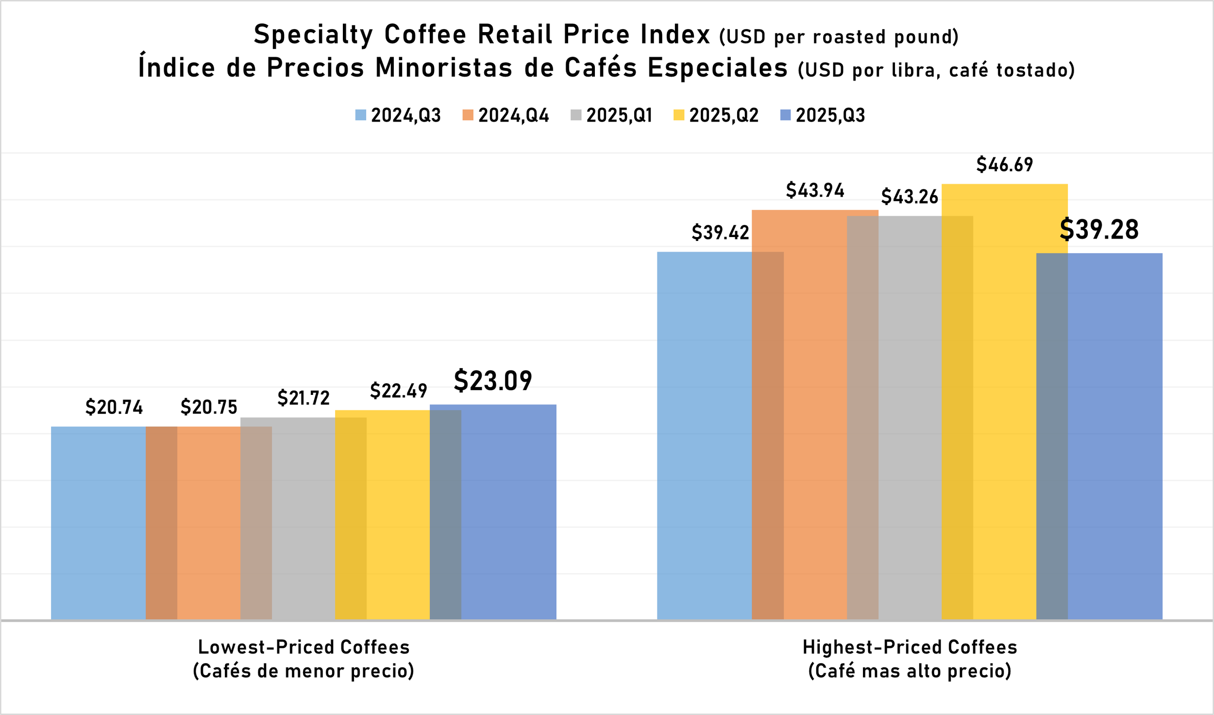 In the third quarter of 2025, the SCRPI fell 9.8%. The average price for roasted specialty coffees at the end of September 2025 was $31.19 per pound. This breaks down into an average of $23.09 per pound for the lowest-priced coffees (+2.7%), and $39.28 for the highest-priced coffees (-15.9%) sold on the websites of the SCRPI roasters.